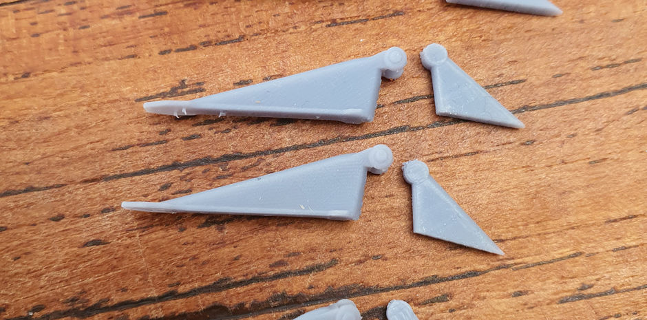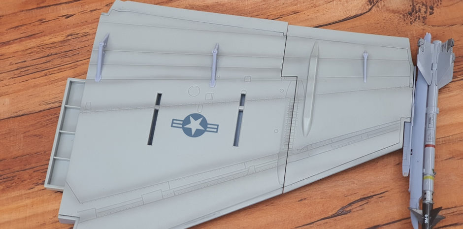 The set contains 2 LAU-7 launcher rails, 2 wingtips with nav-lights, 6 flap actuator fairings, multiple sensors and antenna, and sway braces to be used on the sparrow recesses.
